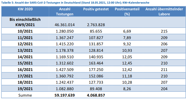 (2, 2i) 19.05.2021; RKI; Tagesbericht vom 19. Mai 2021; Täglicher Lagebericht des RKI zur Coronavirus-Krankheit-2019 (COVID-19), 19.05.2021 — Aktualisierter Stand für Deutschland; S. 10, 9; https://www.rki.de/DE/Content/InfAZ/N/Neuartiges_Coronavirus/Situationsberichte/Mai_2021/2021-05-19-de.pdf?__blob=publicationFile