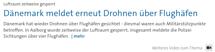 Wenden wir uns der oben aufgefallenen Meldung im Einzelnen zu und versuchen, in größeren Zusammenhängen zu denken. Die Überschrift erscheint harmlos, gar sachlich: „Dänemark meldet erneut Drohnen über Flughäfen“ (2).
